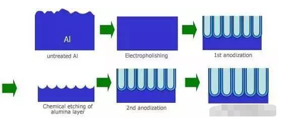 陽極氧化:主要是鋁的陽極氧化,是利用電化學原理,在鋁和鋁合金的表面生成一層Al2O3(氧化鋁)膜。這層氧化膜具有防護性、裝飾性、絕緣性、耐磨性等特殊特性。