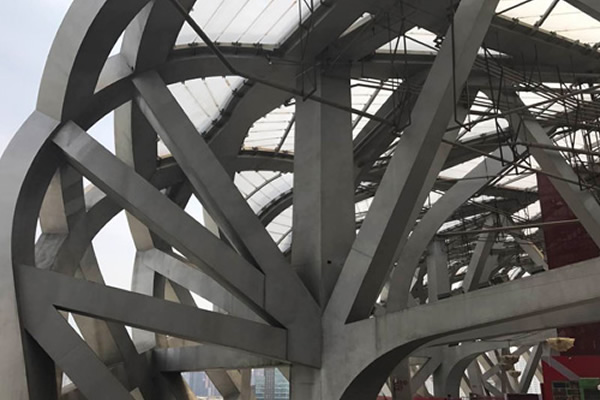 鴻鑫鋼丸獲悉,鳥巢體育館外形結構主要由巨大的門式鋼架組成,共有24根桁架柱,整個建筑通過巨型網狀結構聯系,內部沒有一根立柱,看臺是一個完整的沒有任何遮擋的碗狀造型,如同一個巨大的容器,賦予了體育場不可思議的戲劇性和無與倫比的震撼力。